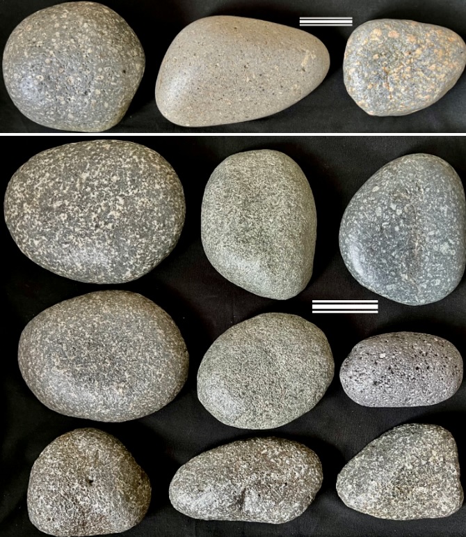 Stonehenge bluestones (Figs 2, 3 and 4) are mostly of spotted and unspotted dolerites, averaging more than 1 tonne with several perhaps up to about 3.5 tonnes. These occur with a few significantly smaller stones, of rhyolite, foliated rhyolitic tuff (silicic ignimbrite), and volcanic breccia. All these stones derive from rock outcrops in Pembrokeshire (e.g., Bevins and Ixer 2018). The broken slab of pale green sandstone known as the Altar Stone weighs about 6 tonnes. Rock fragments matching the monumental stones are abundant in the vicinity of Stonehenge and those nearby have been interpreted to indicate manual ‘dressing’ (shaping) at the construction site. Although there are no ‘dressed’ rhyolite stones, some analysed fragments match and are interpreted to derive ultimately from a rhyolitic tuff outcrop at Craig Rhosyfelin (SN1167 3615), also in Pembrokeshire. The so-called Newall Boulder excavated at Stonehenge and the buried stump of Stone 32d share this apparent origin (Bevins et al. 2023). Sandstone fragments also occur, similar to buried stones (40g and 42c), and on fossil evidence these originate elsewhere in north Pembrokeshire (Ixer et al. 2017, 2020; Bevins et al. 2020). Evidence of shaping of the dolerites, which are exceptionally tough rocks, is scarce, although small fragments of both spotted and non-spotted varieties have been found (Bevins et al. 2023). Sockets in dolerite lintel Stone 150 were hand made, while a groove in Stone 68 seems enigmatic, not clearly shaped by hand. Quite a few of the Stonehenge dolerites closely resemble the polyhedral (flat-faced and sharp-edged) joint columns and blocks that occur naturally amidst and fallen around their source outcrops in the eastern Preseli hills, but many of the bluestones are to an extent rounded, with some unquestionably of abraded round shapes like classic erratics (Fig. 4). As noted by many authors (e.g., Thorpe et al. 1991), the bluestone assemblage in its entirety is a mix that one would expect to have been deposited at the limit of an ice sheet, where large rocks had been transported on top (supra-glacially) with smaller more rounded stones having travelled within or at the base of it.