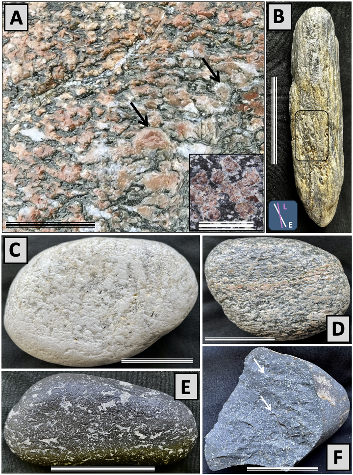 Figure 7 (ii). Horton beach representative collection of Scottish Highlands erratics; scale bars all 5 cm). A. Garnet-rich amphibolite detail, showing plagioclase coronas on garnets (arrows) and characteristic of Lewisian rocks of Harris, Outer Hebrides. Inset for comparison shows garnet amphibolite with plagioclase coronas on garnets, displayed in the University of Alberta Geoscience Garden (copyright John Waldron). B. Poly-deformed and metamorphosed semi-pelite; an early foliation (E) is overprinted by a later pronounced fabric (L), characteristic of the Dalradian Argyll Group and, containing small garnets, closely akin to central Grampian metamorphic basement exposed southeast of the potential source sedimentary rocks (blue diamond in Fig. 7 (i)). C. Anorthosite, most probably from Harris, Outer Hebrides. D. Garnet-amphibolite gneiss. E. Coarse amphibolite. F. Sparsely porphyritic pitchstone (hydrous volcanic glass; arrows indicate small plagioclase crystals).