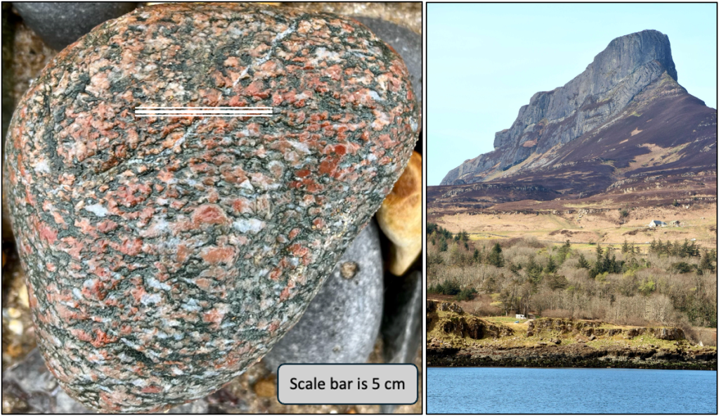 Figure 7 (v). Horton beach boulder of Lewisian garnet-amphibolite gneiss shown in A (above), ultimately derived from Harris in the Hebridean Terrane of northwest Scotland. View is the crag known as Sgùrr of Eigg, the main Highland source of pitchstone in the Inner Hebrides, on the Isle of Eigg (photo courtesy of Mike Branney).