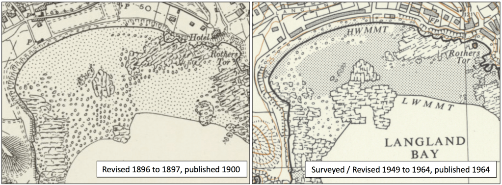 Figure 1. Successive Ordnance Survey 1:10,560 maps of Langland Bay (SS606873) showing significant beach sand loss over some sixty-plus years. The later map (right) shows the Low Water Mark of Mean Tides (LWMMT) closer to shore than previously (it was ‘Ordinary’ Tides on the older map: LWMOT), while rock in the middle of the bay is more extensive, both showing that the sand top surface is lower than it was. Similarly, the stony foreshore is more extensive near the high-water mark in the later edition.