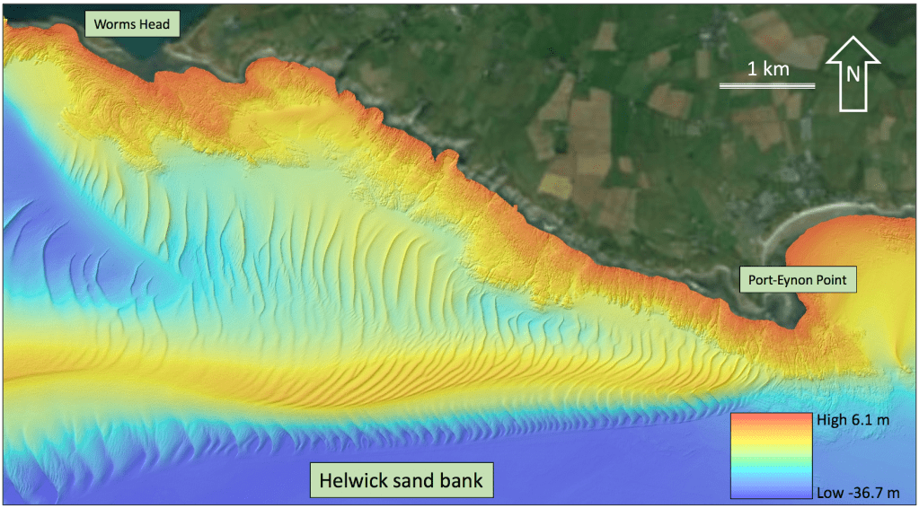 Helwick is known as a ‘banner’ sand bank because it appears tied to a headland, here Port-Eynon Point (Fig. 2). It gains its form and activity primarily from the extreme tidal regime of the Bristol Channel. Another local example is the Nash sand bank, ‘tied’ to Nash Point, the protruding belly button of South Glamorgan. The dynamics of such banks are complex, but they relate to interactions of the headland with flood and ebb reversals of the strong tidal currents (Lewis et al. 2015).