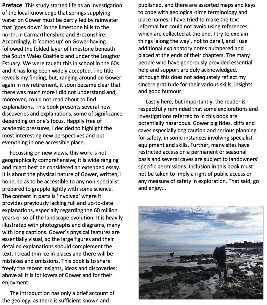 Back-cover text: The author grew up on Gower, exploring, rock climbing and caving whenever possible. School provided the fascinating notion that local water-supply springs were partly fed from limestone hills far to the north, under the South Wales Coalfield. Free ranging on Gower ended when leaving school without A-levels but with a strong desire to work outside. In 2016, retiring as George Herdman Professor of Geology at the University of Liverpool, he returned to Gower and continued exploring, at last able to investigate sources of the springs and the development of the spectacular coastal scenery and caves. Discoveries include:
