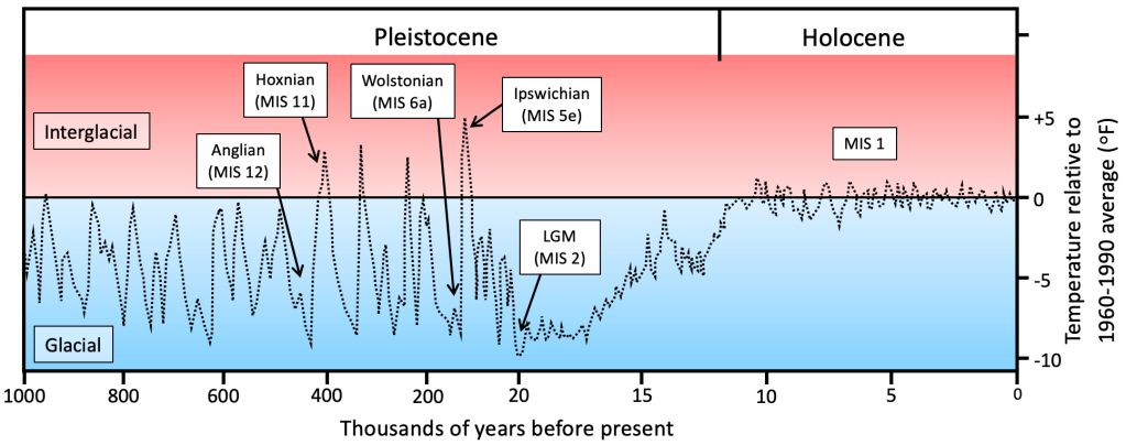 Global temperature fluctuations of the last 1 million years; note the timescale change at 20,000 years. The Pleistocene trace is a hybrid of Antarctic and Greenland data modified to represent global conditions (Lisiecki and Raymo 2005; Jousel et al. 2007). Global temperature estimates over the ~12,000 years of the Holocene are from Marcott et al. (2013). LGM is Last Glacial Maximum; MIS is Marine Isotope Stage.