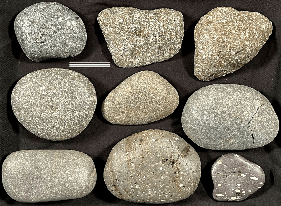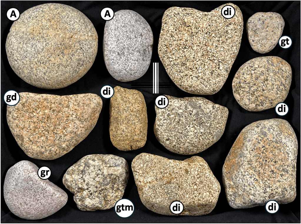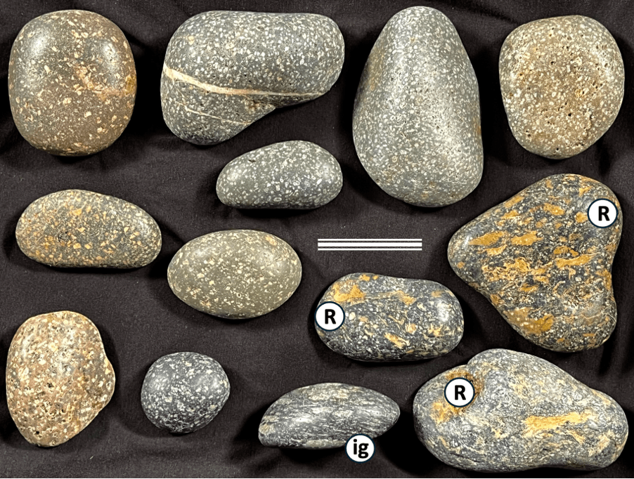 The following pictures (Figs 8-11) show the truly remarkable diversity of igneous-rock erratics found on Gower, currently more than 20 distinct types. None of this represents new research findings, but it is a unique pictorial compilation; many erratic types have long been known to record erosion of distinctive rock outcrops that occur in Pembrokeshire. Although it is impossible to locate sources precisely, several rock types unmistakably come from known relics of ancient volcanoes and their sub-volcanic plumbing systems*, i.e., their associated magmatic intrusions, in Pembrokeshire. Thus R below is from a unique volcanic unit on Ramsey Island and certain gabbros with distinct mineralogy and texture derive from the major headland and skerry-forming intrusions centred around St David’s Head. Along with the volcanics that form Skomer Island and sea cliffs west of Fishguard (e.g., Fig. 6), the igneous rocks evidently formed tough and upstanding obstacles within the flowing ice, then perhaps beneath the ice and/or as nunataks (partly exposed) and now widely remaining as sculpted prominences arising from the marine-eroded coastal platform. *(The author has mapped Ramsey Island, the St David’s Head intrusions, and the coastal section west of Fishguard in detail, and is familiar with the Skomer volcanics).