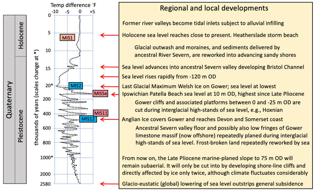 In terms of maximum age of main cave development, the sinkhole-drain systems like ONP evidently formed in the marine planation surface that was cut in the Late Pliocene, before the onset of the Quaternary ‘Ice Age’ 2.58 million years ago. There is no evidence of glaciation on Gower before the Anglian event at 450,000 years ago, so one might imagine a 2-million-year evolution of a karst surface during the successive glacial and interglacial episodes of that time, when high-stand sea levels cut our coastal cliffs into the marine-cut platform.