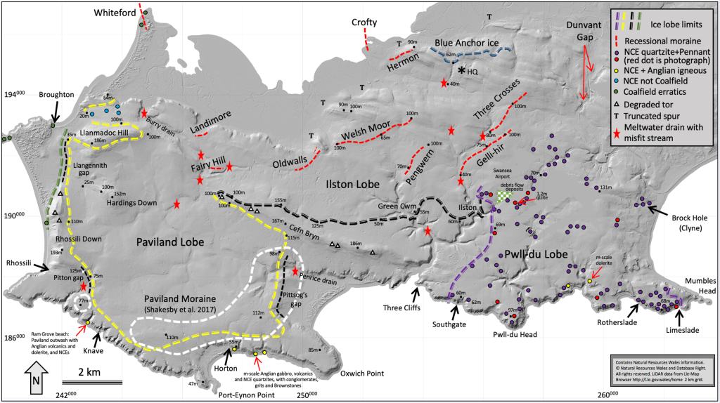 The Pwll-du Lobe cuts across and is distinctly different from the eastern reach of the Ilston Lobe, being marked by substantially larger quartzitic north-crop erratics (NCEs) with abundant relatively angular Pennant blocks and limestone (only towards the southwest), in addition to ‘normal’ north-crop LORS Brownstones and UORS quartz-pebble conglomerate. The purple and red dots mark the main exposures of the large erratics that distinguish the Pwll-du Lobe.