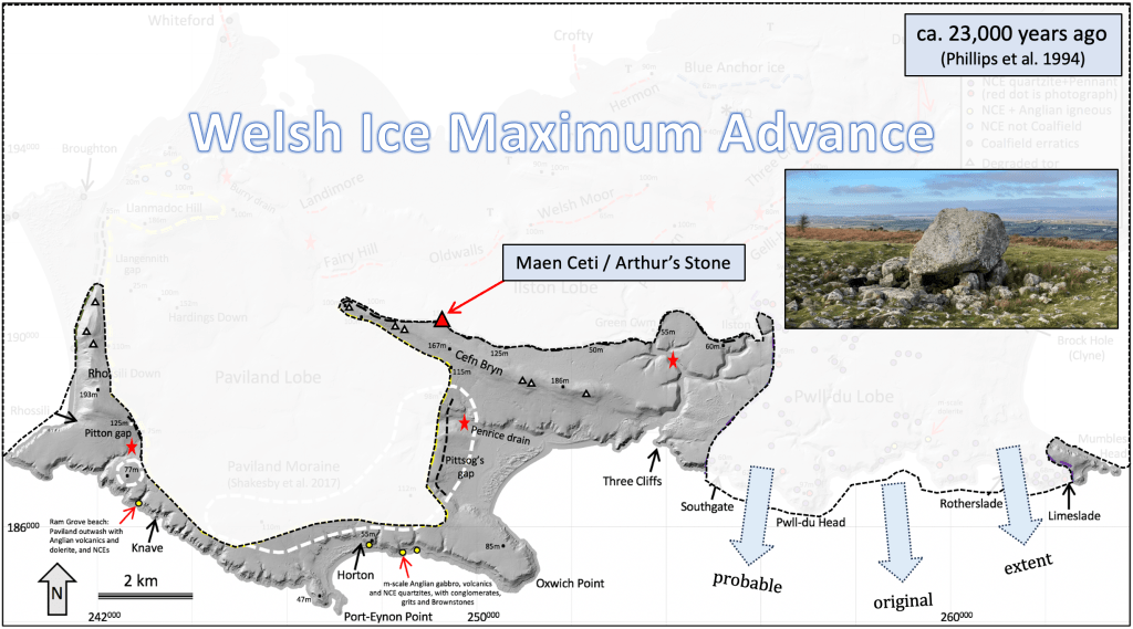 Interpretation of the Last Glacial Maximum ice limits based on the map above. Arthur’s Stone marks the high limit on Cefn Bryn; next time you visit there, imagine that to the north across the modern Loughor Estuary and over the hills towards the Gwendraeth valleys you would have seen only the Welsh ice sheet.