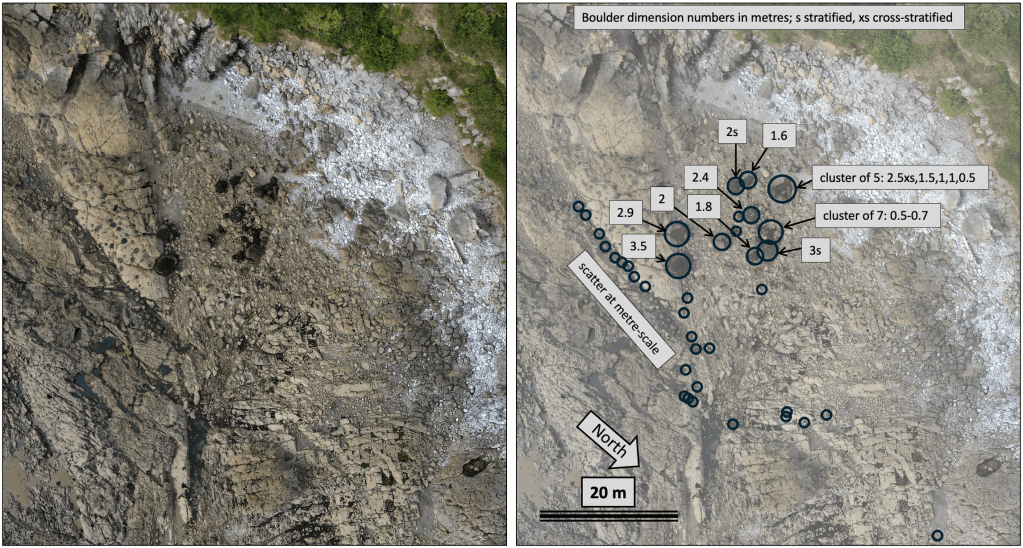 Figure 25. Drone photo vertical view of the mainly seaweed-clad gravel boulders, with overlay map (right) showing the close clustering of this unusual rock, with some of the larger dimensions of them given in metres. The close grouping and limited scatter of smaller fragments suggest that the boulders are parts of an original singular occurrence somehow isolated and stranded on the modern limestone beach platform. (Drone photo courtesy of Andy and Antonia Freem).