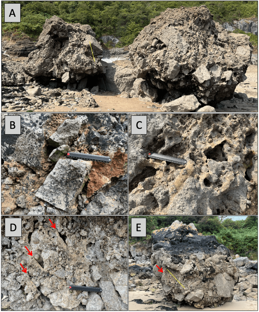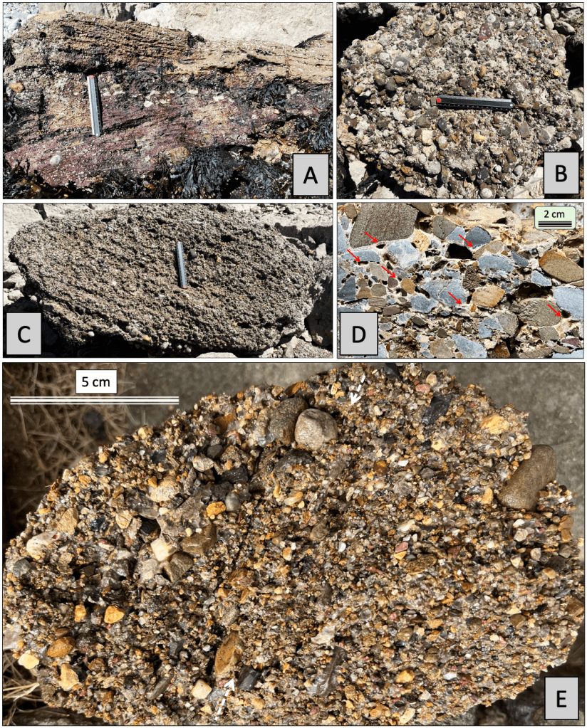 Figure 26. A-C. Natural surfaces of the enigmatic boulders; ruler is 15 cm. A. Uppermost parts of the deposits in places are coarse, pebbly sandstone, here showing cross-stratification indicative of deposition from a moderately strong flow of water. B. Weakly stratified, poorly sorted pebble gravel-conglomerate. C. Moderately stratified and weakly cross-stratified pebbly gravel. D. Cut face of pebbly gravel showing calcite cement partially infilling original voids (red arrows) between pebbles mostly of Pennant sandstone. Calcite clearly grew from pebble surfaces, in many places leaving crystal-lined voids. Quite speculatively, this porosity, peculiar to the these enigmatic boulders, may be how seaweeds colonise the surfaces unlike elsewhere on adjacent impervious limestone surfaces. E. Acid-etched broken-cobble surface, showing poorly sorted gravel and pebbly gravel with indistinct stratification (parallel to the line between white dashed arrows). The mix of rock types and of rounding versus angularity is shown in Figure 27 D-H below, which is of this sample with its calcite cement completely dissolved away.