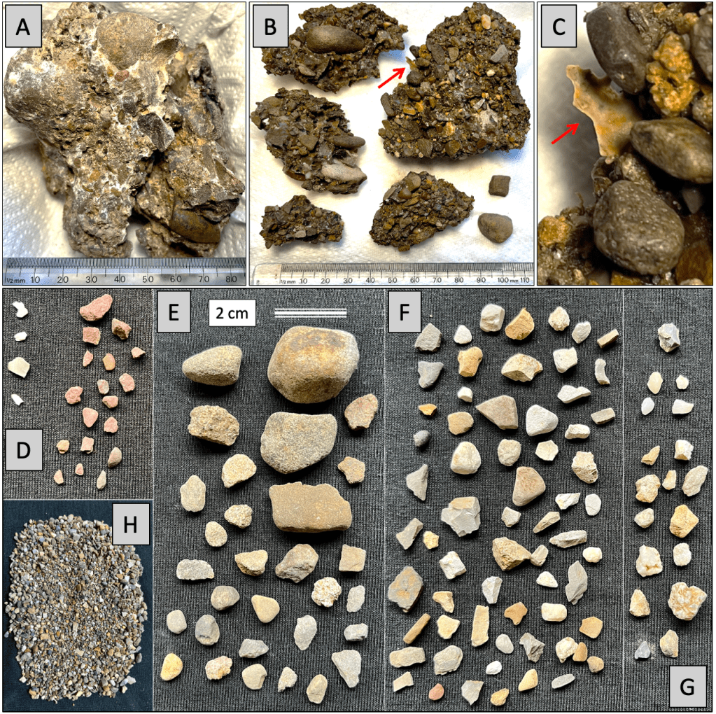Figure 27. A-C. Calcite-cemented pebble conglomerate with partially dissolved counterparts showing well-rounded pebbles with embedded organic ‘flake’ (arrows) taken to be (insoluble) bone or tooth material, primarily calcium phosphate as the mineral apatite or hydroxyapatite. D-H. Completely disaggregated constituents of the rock shown in Figure 26 E; scale bar applies to D-G. D. Insoluble organic mineral flakes (left) and assorted red sandstone and siltstone fragments (right) with variable angularity/rounding, probably mostly Old Red Sandstone. E. Mostly Pennant sandstone including well-rounded pebbles but also mostly smaller angular fragments. F. Assorted fine-grained sandstone and siltstone including all variations from well-rounded to highly angular; several of the rock types are not recognised and the sources of all are unknown. G. Fragments of chert (possibly flint at top), quartz-sandstone and vein quartz. H. Sand and gravel remainder of sample.