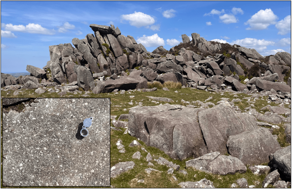 What is ‘spotted dolerite’? Igneous rocks form from molten material – known as magma – which can either be erupted via volcanoes at the Earth’s surface, where it tends to cool quickly, or be intruded at depth to cool more slowly. Magmas may initially partly crystallise so they contain individual free crystals (phenocrysts) or clusters of them (glomerocrysts). Preseli dolerites represent magmas intruded as sheets beneath erupted lavas of similar composition (Fishguard Volcanic Group) and within what had been sea-floor sediments, at the time probably retaining some water. Some of the magmas contained cm-scale free crystals of plagioclase, others did not. In the case of the developments of ‘spots’, it appears that late-stage volatiles and heat from the magma caused hot-water circulation (i.e., hydrothermal) that affected the cooling and crystallisation of the intrusion. Here fresh large crystals of plagioclase in the cooled magma became replaced by fine-grained secondary minerals. Later, during deeper burial with regional heating and increased pressure, owing to ‘mountain building’, the minerals recrystallised finally to form the spots we see today. (See Bevins et al. 2021). The Preseli spotted dolerite outcrops only occur in one small area of the eastern Preseli hills, forming the highest summits and conceivably belonging to a single intrusion now partially masked by superficial deposits.