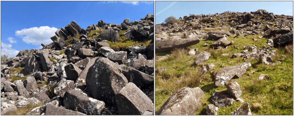 Figure 5. Outcrop of spotted dolerite at Carn Goedog (SN128 332). The slope abounds with naturally formed and fallen slabby and polyhedral (multi-faceted) columnar, weathered monoliths. Dolerite intrusions like these in the Preseli hills are common widely in Wales and everywhere their upland outcrops break, weather and collapse in similar fashion, without any human intervention.