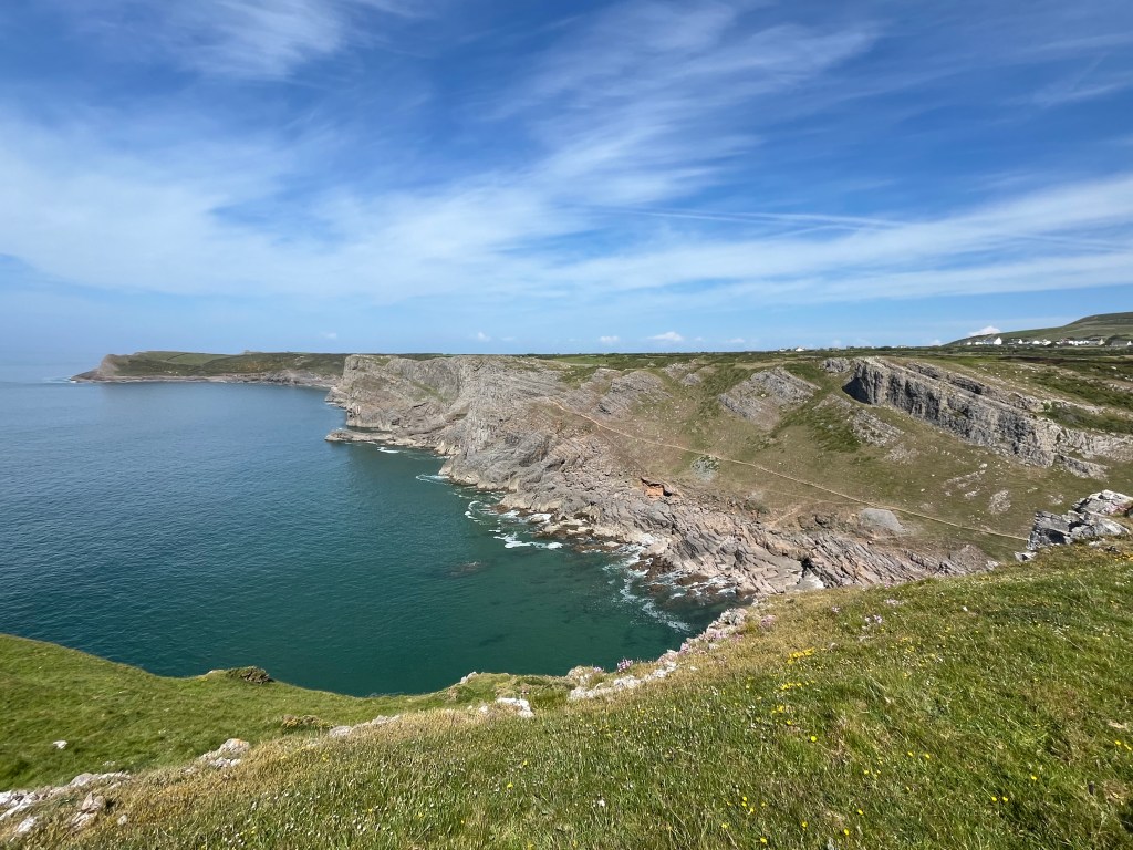 Figure 1. South Gower scenery is dominated by a gently sloping marine platform that was cut just prior to the Quaternary Ice Age. The cliffs, including versions currently offshore, were mostly cut into this platform during successive relative high stands of the sea during the Quaternary. The sea cliffs are riddled with caves and solution tubes and the surface has numerous depressions that are sink holes and/or collapse pits that widely connect in three dimensions within the limestones. The Anglian ice sheet must have advanced here over cavernous karst-featured land that was at least in part modified by periglacial weathering and sedimentation. It is inferred below that the ice shaped some of our valleys and cliffs during its passage.