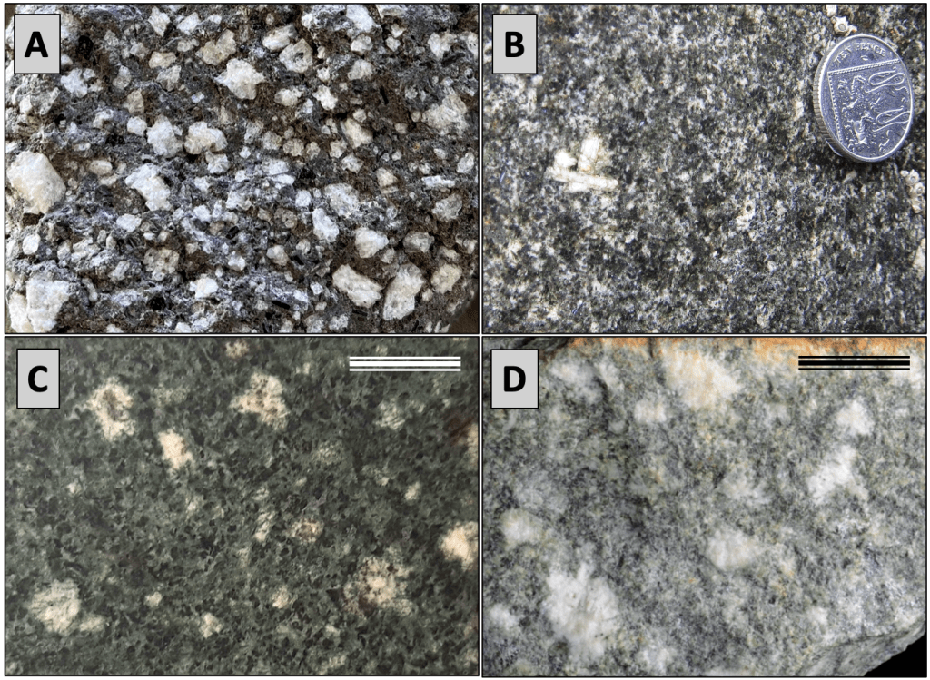 Figure 7. A. Perfectly fresh plagioclase crystals (phenocrysts) with sharply defined edges in a fine-grained lava matrix (collected from a Chilean volcano). B. Rather dirty-looking recrystallised plagioclase crystal cluster in the Limeslade dolerite erratic on Gower (Fig. 11), considered to be typical of crystal-bearing but non-spotted dolerites derived from Pembrokeshire. C and D. Examples of Preseli spotted dolerites showing the fuzzy outlines characteristic of an early phase of hydrothermal alteration. Scale bars are 1 cm. (Photos C and D courtesy of Richard Bevins).