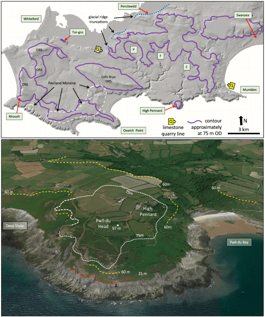 Figure 2. (Fig. 23 of Kokelaar 2021). (Top) Shaded-relief LiDAR image of peninsular Gower highlighting aspects of the topography. The purple contours at approximately 75 m OD indicate the higher parts of the surface that perhaps were beyond the reach of the sea (marine planation). One might imagine this as a short-lived archipelago of islands lacking cliffed shorelines. Cefn Bryn and the western summits of Old Red Sandstone (ORS) probably were prominent landscape features for considerable geological time. The ‘limestone quarry line’, Q-Q, indicates the string of numerous old and more recent quarries in the upper parts of the Carboniferous Limestone succession. The Late Pliocene marine planation surface is only well developed south and west of the quarry line, on the limestone. Limestone outcrops seemingly not reached by the sea include High Pennard, the ridge of Oxwich Point, Tor-gro and an area west of Mumbles. The Paviland Moraine (from Shakesby et al. 2018) formed some 23,000 years ago from the Devensian glaciation. (Base data © Natural Resources Wales). (Bottom) Oblique Google Earth view north over High Pennard and the seaward end of Bishopston Valley. Like the purple contour in the image above, the 75 m OD white contour distinguishes high ground that may have remained beyond the reach of waves during the Late Pliocene. The general marine planation level here is at about 60 m OD. Both Anglian and Devensian glacial ice crossed here. The enigmatic boulders discussed below occur on the west side (left) of Pwll-du Bay. Karst landscape and periglacial features following recession of the Anglian ice are implicated in explanations of the enigmatic boulders, below.