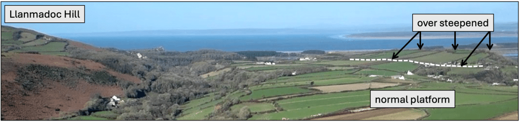 Figure 34 (Base image: https://www.nationalarchives.gov.uk/doc/open-government-licence/version/3/). A. The southwestern shoulder of Llanmadoc Hill is a steep slope without any obvious geological cause: possibly over steepened by ice from west-northwest. B. The platform area inland from the cliff tops (Tor-gro) steepens up towards northeast, rather than being a uniform gently inclined marine-cut platform as occurs elsewhere: possibly scoured by ice constrained between here and Llanmadoc Hill (see panel below).