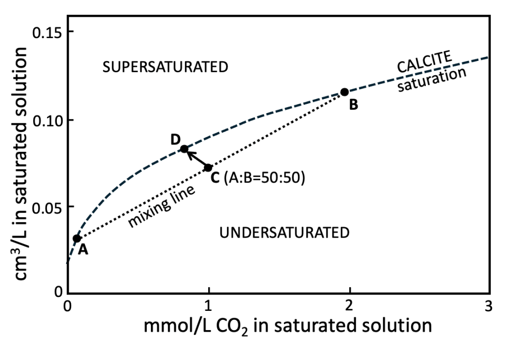 Mixing corrosion explained. Bögli (1964, 1980) recognised that because the saturation of calcite in mildly acid aqueous CO2 solutions is non-linear, mixing of two differing saturated solutions would produce an unsaturated mixture that could then be ‘aggressive’ and cause further calcite corrosion. Fig. 20 shows that, for example, mixing of solutions A and B – in this case in equal amounts 50:50 – would create the solution C that could then dissolve more calcite until reaching saturation at D. The mixing corrosion phenomenon is well known at and downstream of the confluence of underground streams with differing chemistry and it can be favoured especially beneath an ice sheet that feeds diverse waters widely into karst substrate with confluent drainage.