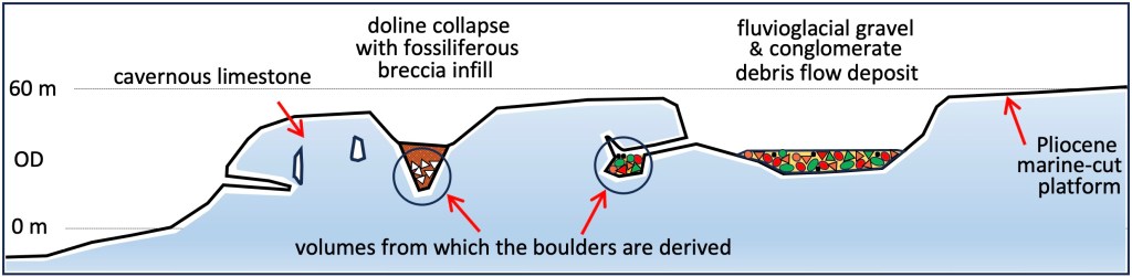 We know that many Gower caves have existed from long before the Ice Age, so here we may consider a pre-Anglian karst terrain, widely planed by the Late Pliocene seas some 3 million years ago and with valleys and dolines or sink holes. This landscape of platform, holes and cliffs necessarily will have been modified by the passage of the Irish Sea Ice Sheet, probably of several hundred of metres in thickness. The Pwll-du boulders perhaps provide a glimpse of conditions during retreat of that Anglian ice.