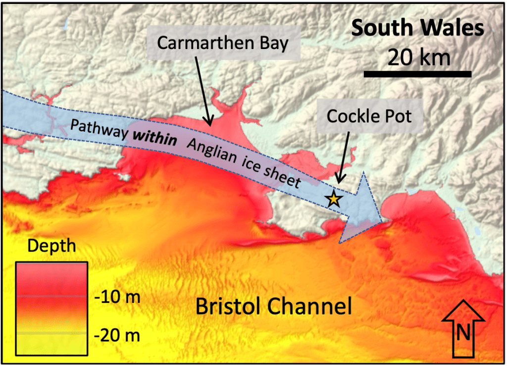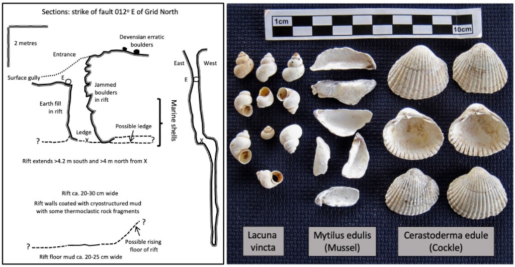 This cockles evidence is culled from my book (Kokelaar 2021, pp. 160-161). In one of our attempts to recover access into Llethrid Swallet cave, in March 2021, we started a new dig where we had found a strong draught from a narrow fault-controlled fissure that was partly filled with debris from the surface. It became known as Cockle Pot, unsurprisingly named for cockles excavated there. Initially it seemed we might be digging into a Romano-British midden; there are relics of this occupation nearby and a hoard of Roman coins had been discovered very close to this site. Soon, however, it became clear that the shells were dispersed in freeze-thaw textured till-cum-soil to at least 4 m below the surface. Further, there were other marine shells present showing that they do not represent any deliberate collection for food. The ground surface around there is littered with Devensian north-crop glacial erratics, but these are absent in the underlying cockle-containing fissure fill.