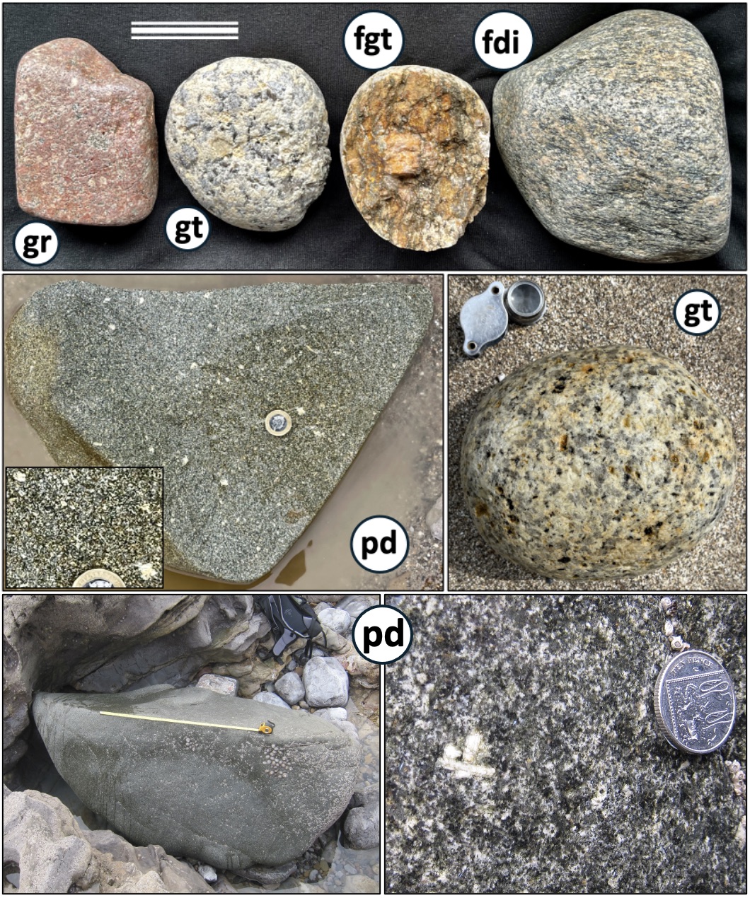 Figure 11. Diversity of igneous erratics: (Top row collected from Horton SS475855). gr is granophyre, gt is granite, fgt is foliated granite and fdi is foliated diorite; both foliated varieties are possibly from Scotland. Middle row gt is from Bantam Bay SS5743 8668 (Pwll-du) and pd is porphyritic (non-spotted) dolerite from Horton SS475 855. Bottom is the porphyritic dolerite boulder on the intertidal platform at Limeslade (SS624 870), weighing roughly 4 tonnes. Tape measure shows 1 m. Probable Skomer silicic volcanic conglomerate occurs as similarly large boulders below Western Slade (SS484855; Kokelaar 2021, Fig. 57).