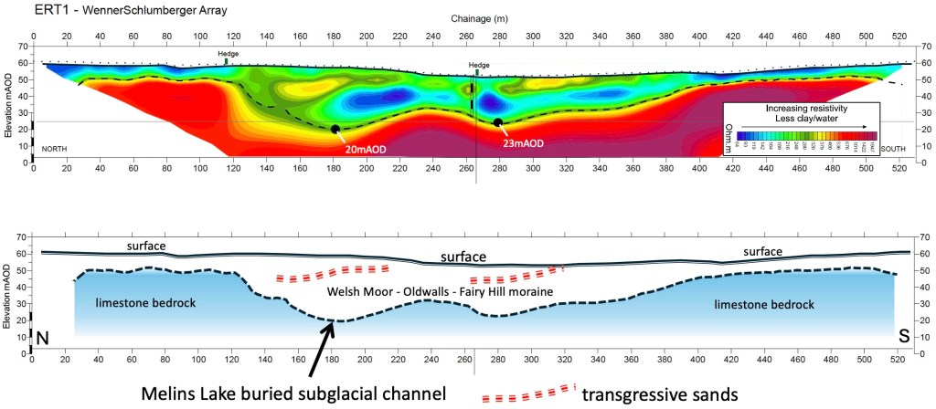Figure 22. Geophysical resistivity survey across the Melins Lake subglacial channel where it is largely infilled by thick deposits of the Devensian recessional Welsh Moor – Oldwalls – Fairy Hill moraine. The oblique features within the infilling moraine are sandier parts that as the moraine was built up advanced (transgressed) farther southwards. The survey and processing were kindly provided by friends Alex Lewis and Kathrin Zorn of Terradat (UK) Ltd.