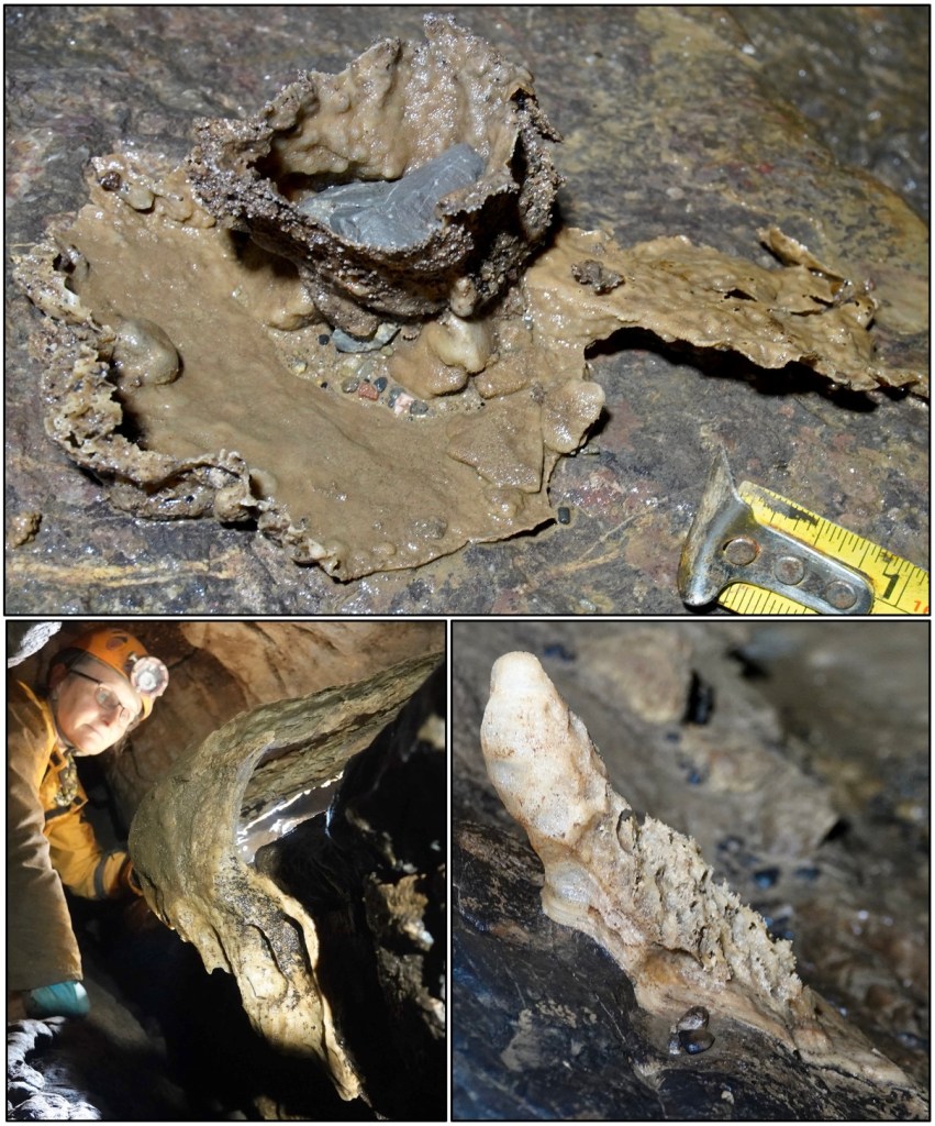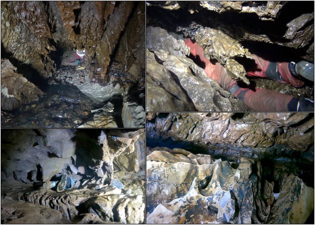 Figure 16. Most penetration farther into the cave involved extremely uncomfortable and tight-space writhing over and under and between unusually spiky, bladed and sharp-edged limestone flanges and spines. Progress typically involved breaking off blocking flakes and learning the contortion required to get through ... hats off indeed to the larger team members! These characteristically sharp and tortuous limestone-surface forms of the cave are interpreted as reflecting the pronounced effect of a solutional (dissolving) process that readily occurs under an ice sheet, i.e., ‘mixing corrosion’ – as explained below. Further suggesting subglacial cave development, irregular roof-pendant limestone shapes, as seen in the lower two images, typically mark times when aggressive water was forced to flow along the roof contact because of sediment infill beneath. This upwards directed corrosion, called paragenesis, is common where caves are influenced by nearby glacial erosion that produces copious sediment, which can fill passages but then may be subsequently washed out.