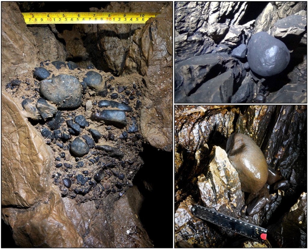 Figure 19. The cave preserves numerous examples of infill involving typical north-crop erratics (of the 23,000 year-old Devensian glaciation), here mostly coated in black manganese oxide and in places with sandy matrix. These show that the cave was developed largely as-is before the Devensian glaciation delivered this debris. The cobbles, many of north-crop quartzite, are jammed at various levels throughout Ogof New Park and, given the features suggesting subglacial development, prove its predominantly Anglian-age development. Given that we know that many Gower caves existed before the Quaternary Ice Age, we should anticipate that the pre-Anglian limestone landscape around here was already karst with sink-holes, collapse pits and underground conduits, but the extraordinarily tight and gnarly New Park system seemingly requires the special circumstance of having mainly formed under thick Anglian ice.
