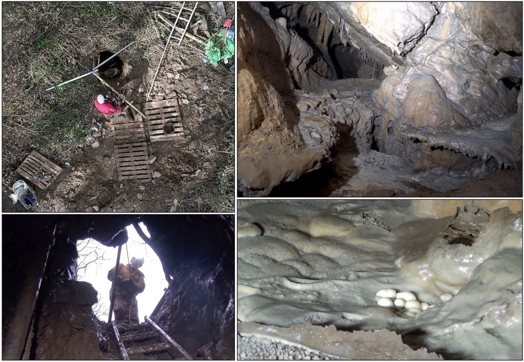 Figure 15. Drone-vertical view of the entrance shaft and hauling rig. This excavation-enlarged hole followed one of the many crevices that took flood water from across the floor and also in low banks of the host ‘collapse pit’, expecting it to become confluent with wider passages downwards. (For the record, I admit here that I thought it would not ‘go’. There were many setbacks, but remarkable camaraderie and perseverance paid off and happily proved me wrong.) Each step farther into the cave amounted to a breakthrough and despite persisting tightness of passage, commonly with obstacles broken out to get through, the hard labours did repeatedly access special spaces. The exceptional Birthday Passage (for Sarah) is beautifully ornamented, here showing classic stalactites, stalagmites and flowstone-cemented cobbles, with crystal-rimmed pools and rare centimetre-scale cave pearls.