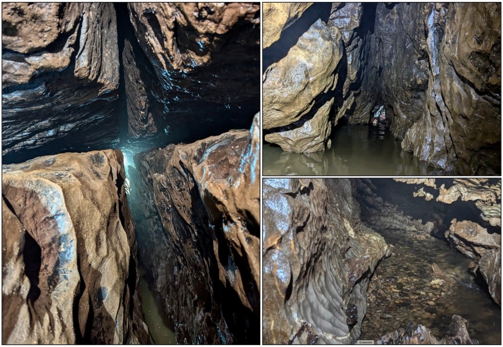 Ogof New Park was ‘dug’ into and continuously ‘developed’ in 2024 by an intrepid team of caving friends, led by Andy and Antonia Freem. It is the first significant cave find on Gower in recent decades, at about 400 m long. It proved to be a serious and strenuous undertaking to penetrate fully, with its ‘difficult’ character proving to be a feature of scientific interest – as explained here (Figs 15-19). We currently do not know if it can be pushed farther. The target was to follow intermittent flood drainage within a large sinkhole-cum-collapse pit. Initial attempts to follow the sinking stream were thwarted by floods and wall collapse so that eventually a mostly debris-filled series of cracks in solid limestone was cleared and considerable volumes of rock broken out and removed to enable continuation downwards. At this early stage I decided that being fat was a great advantage so, while I could, I helped pull a few buckets up from the top of the ominous hole… Far better than the read below, the Youtube video ‘Discovering a new cave in Gower: Ogof New Park https://youtu.be/fZIL388uo9Q‘ by Andy and Antonia is the best way to see the cave and its exploration; it includes appropriate credits to the entire team.