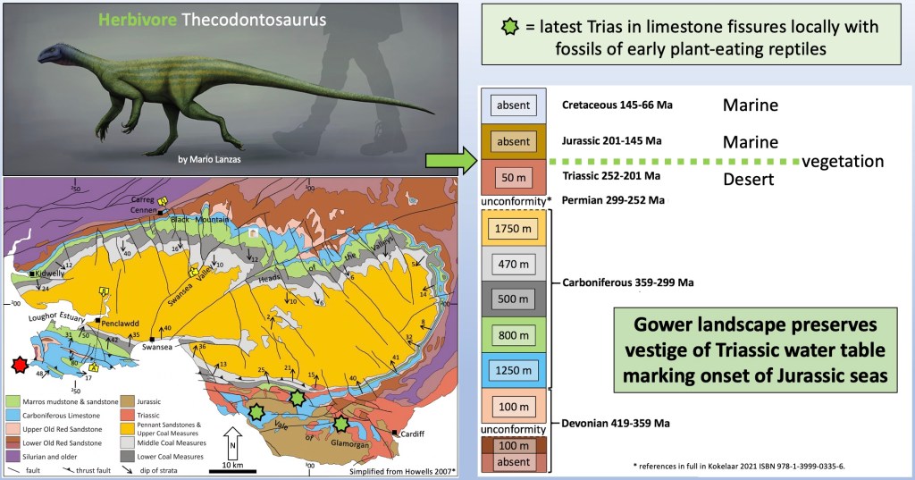 Figure 23. Occurrences of caves known to have formed at the end of Triassic times, with the Worms Head locality shown as a red star and previously identified sites in green. Key to appreciate here is that despite open faults forming in Late Triassic time, dissolutional caves did not form as there was barely any persistent water in the desert environment. The coincidence of herbivore fossil remains in karst caves shows the end-Triassic development of both vegetation and water tables, held in the ground by advancing sea level just ahead of marine conditions.
