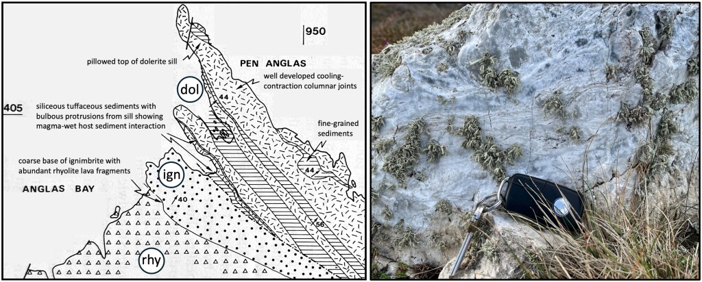 Figure 6. West of Fishguard, the prominent headlands Penfathach, Y Penrhyn and Pen Anglas (shown here) expose large craggy, sea-cliff outcrops of diverse rhyolites, silicic ignimbrites and non-spotted dolerite that must have contributed to the erratic load of the overpassing Irish Sea Ice Sheet and can be visually matched with samples from Gower. The most prominent headland, with the fog-horn housing and pillar-monument, comprises columnar-jointed dolerite sheets (dol) intruded into volcanic sediments, while the middle of the section is silicic ignimbrite (ign) and the main exposure to the right is variously banded, nodular and brecciated rhyolite (photo on right). This coast faces north and the smoothly rounded headland surface profile here almost certainly registers erosion by the Irish Sea Ice Sheet that was forced up and over here. (Map from Kokelaar et al. 1984, p. 308).