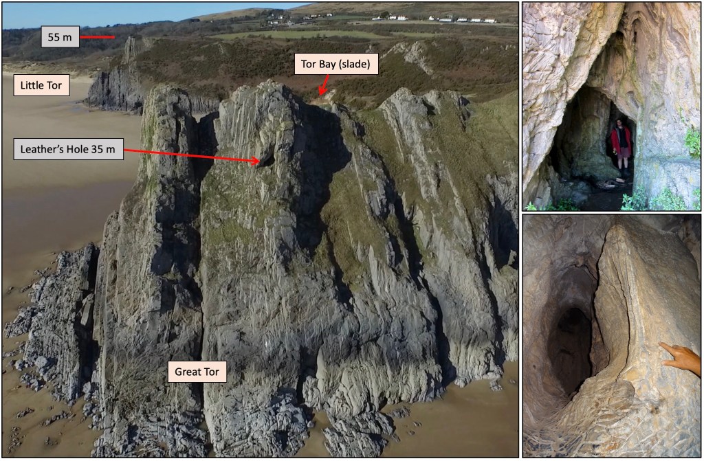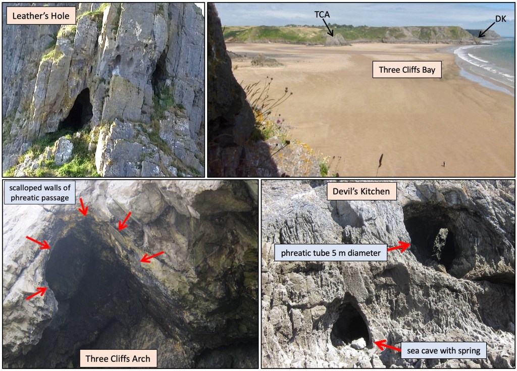 Figure 32. Top right is the view from the larger entrance into Leather’s Hole across to Three Cliffs and the cliffs containing Devil’s Kitchen. All were once embedded in a continuous limestone massif that was deeply eroded to form the 60 m OD platform, as well as the existing sea cliffs and the valley that emerges at the bay. Bottom right neatly shows a characteristic near-cylindrical phreatic tube, formed beneath a water table, in contrast to the sea cave with typical A-form owing to most mechanical wave-related erosion being lowest down.