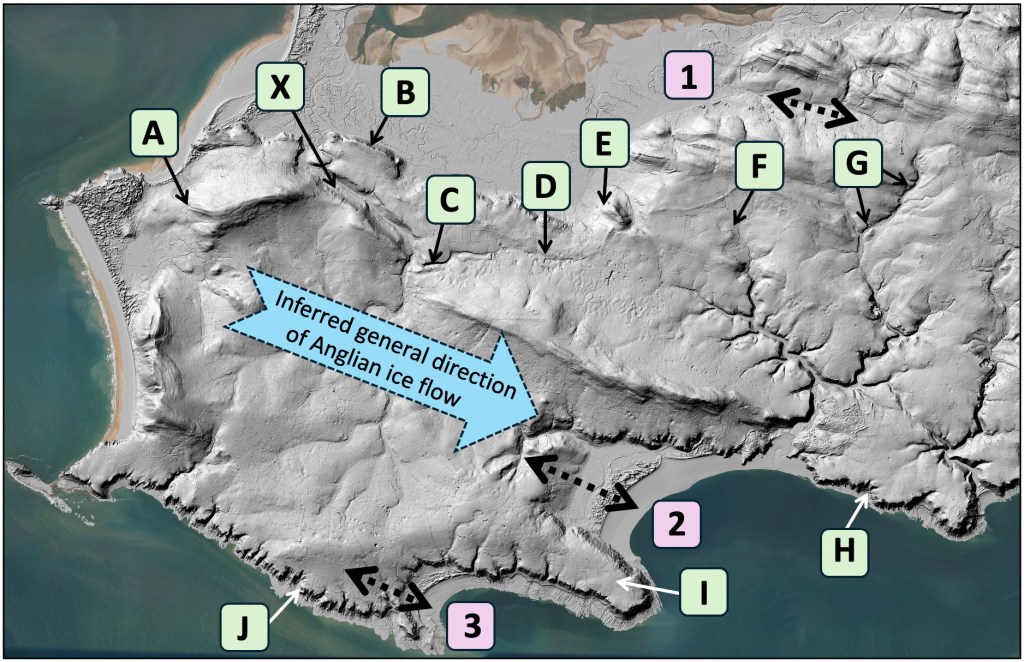 D. Ogof New Park subglacially formed cave system (see separate section). E. The southwestern side of Cilifor (hill fort) is a steep slope without any obvious geological or hydrological cause; although sandstone beds occur in the ridge crest the main slope and ‘valley’* are in relatively soft mudstone: possibly over steepened by ice from west-northwest. *(The southeast end of this valley is partly filled with the Devensian Welsh Moor recessional moraine). F. Deep, narrow gorge cut in mudstone capped by Devensian till. As at G, this cutting through a barrier of relatively soft rock has no obvious original headwater drainage and is currently fed from a minor spring (mapped as ‘rises’): possibly a subglacial streamway. G. Gorge cut through sandstones and mudstone, currently with a misfit stream meandering in Devensian glaciofluvial outwash (Kokelaar 2021, p. 103). Devensian till apparently fills a pre-existing rocky channel: possible subglacial streamway. H. Ice-sculpted sea cliffs (see Fig. 33). I. Oxwich Point differs from the gently sloping marine platform elsewhere in being a ridge that slopes evenly on either flank, to southwest and northeast. It is draped in Anglian till and conceivably was shape-modified between thick ice on either flank flowing east-southeast. J. Ice-sculpted sea cliffs (see Figure 33). X. This most striking of channel features was probably initiated under the Anglian ice but is, however, known to have been a drain from beneath the Devensian ice (Kokelaar 2024) so that its original form and course remain a mystery (compounded by a buried channel towards Landimore!) .