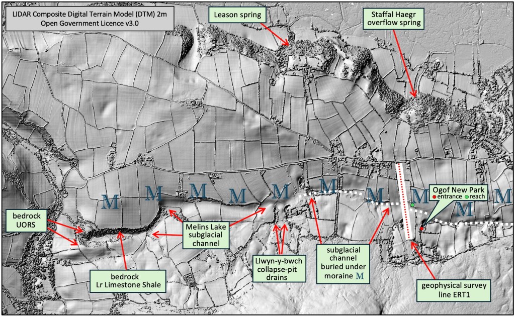 Figure 21. Trace of the Melins Lake subglacial channel eastwards from fully exposed in bedrock to substantially obscured by till and the Welsh Moor – Oldwalls – Fairy Hill moraine (letters M) above the Ogof New Park subglacially formed cave system.