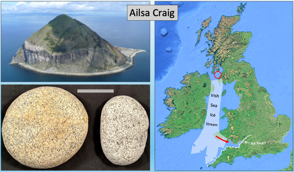 Figure 12. Top. Map of the Bristol Channel area showing in yellow the most probable Anglian ice-transport path based on unequivocal occurrences on Gower and farther east of igneous erratics transported east-southeastwards from Pembrokeshire by the Irish Sea Ice Stream. ‘Spotted dolerite’ characteristic of Preseli summit outcrops is not found as erratics within the main trail (shaded yellow) whereas it does form many of the Stonehenge bluestones. This relationship, between glacial-ice movements manifestly “towards Stonehenge” and the lack of a clear glacial trace right up to Stonehenge (the contentious reach) is the root of the controversy around glacial versus human transport of the bluestones. The ‘Likely Local Welsh Ice’ (pale blue arrows) would probably have been of variable reach during the two main glaciations (Anglian and Devensian) and it is conceivable that the ‘Limit of Preseli spotted dolerite erratics’ (shown in green) reflects local ice of the later glaciation that partly buried Anglian deposits, as occurred on Gower (Kokelaar 2021, figure 46 and below). Bottom. The Ailsa Craig erratics on Gower prove transport from western Scotland via the Irish Sea Ice Stream. Other exotic erratics on Gower probably also came the same way… (See discussion of the Altar Stone origin, below).